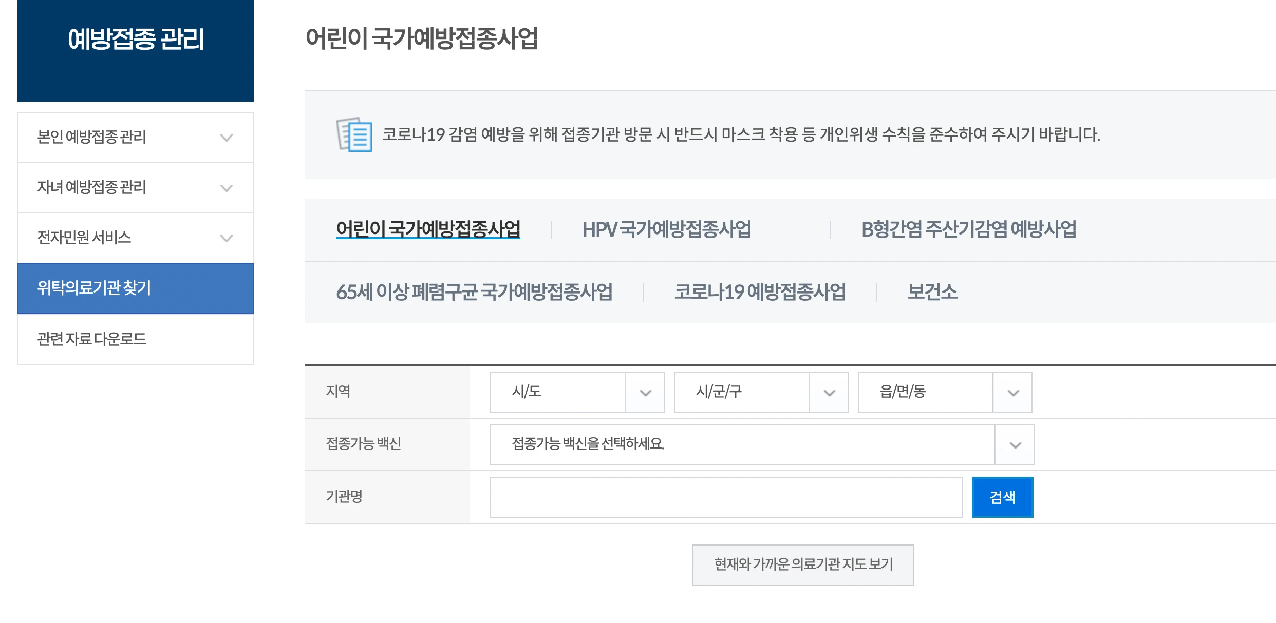 1. 질병관리청 홈페이지에 접속 후 예방접종관리 → 위탁의료기관 찾기